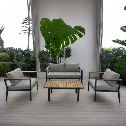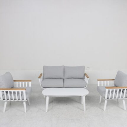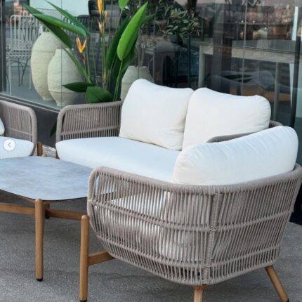 סט ספות אלומיניום חבל יוקרתי 4 חלקים. כולל ספה תלת מושבית, 2 ספות יחיד ושולחן קפה עם זכוכית קרמית. עיצוב מודרני, נוחות מקסימלית וחומרים איכותיים. רגלי אלומיניום במראה עץ טיק וכריות אולפין עמידות למים.