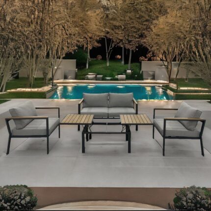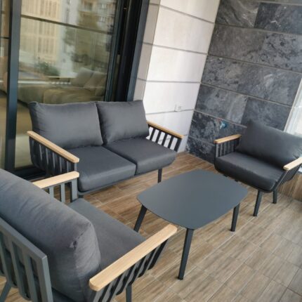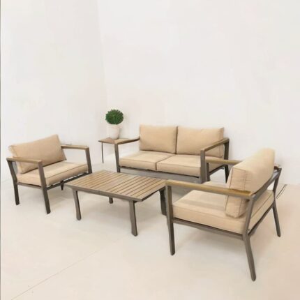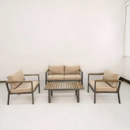 - רגלי אלומיניום במראה עץ טיק: רגלי ספות ושולחן אלומיניום מוברשות במראה עץ טיק, להשלמת המראה הטבעי.