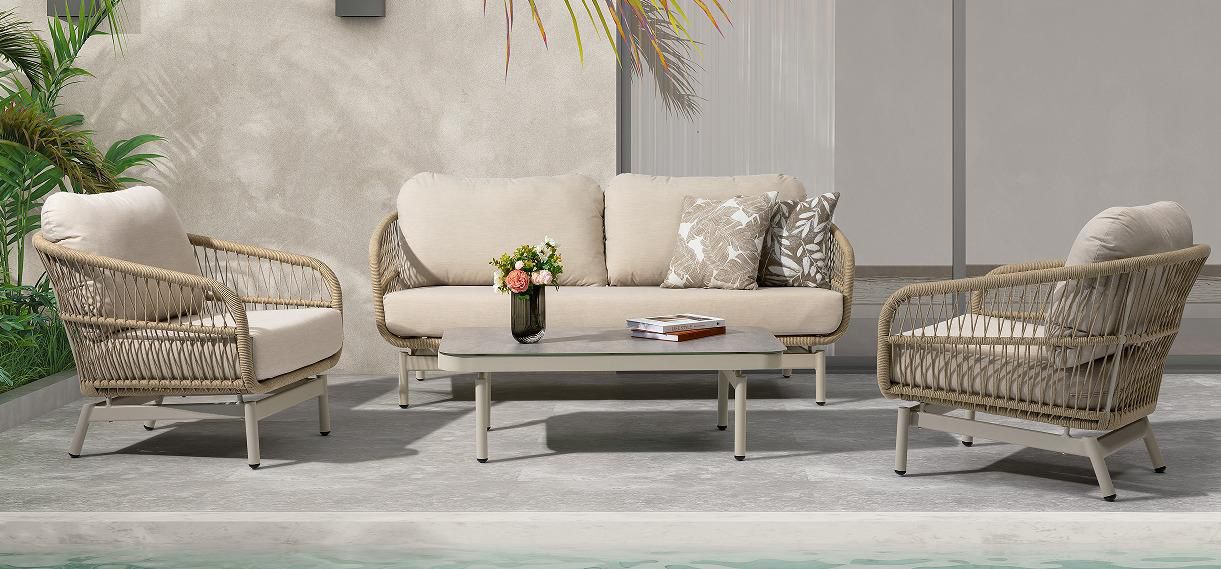 מערכת ישיבה יוקרתית ומעוצבת לגינה ולמרפסת המשלבת שלדת אלומיניום חזקה עם שזירת חבל איכותית במראה מודרני ואלגנטי.