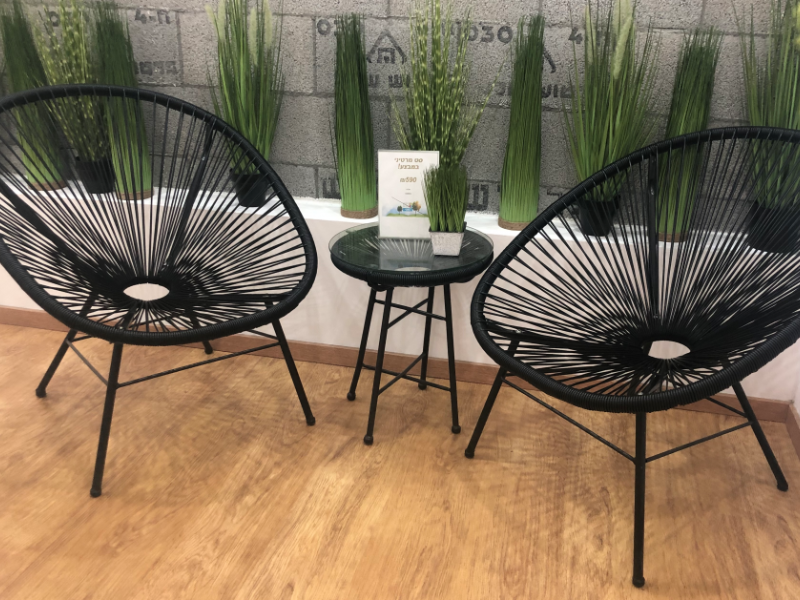 - הכיסאות והשולחן מגיעים במעטפת רצעות PVC עגולות, ללא כריות/ריפוד.
