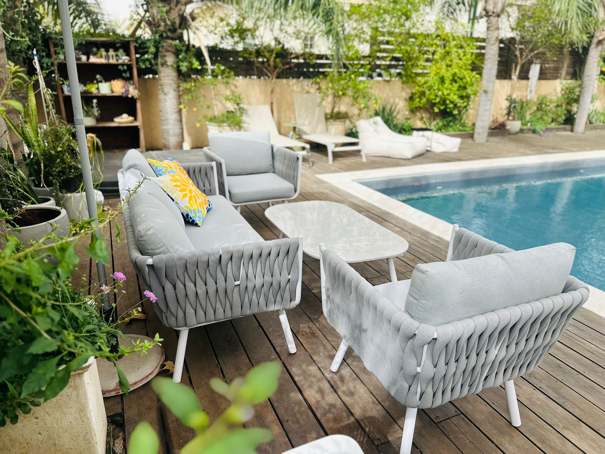 - מערכת ישיבה למרפסת/ לגינה הכוללת ספה תלת מושבית מפוארת + 2 כורסאות ושולחן קפה.