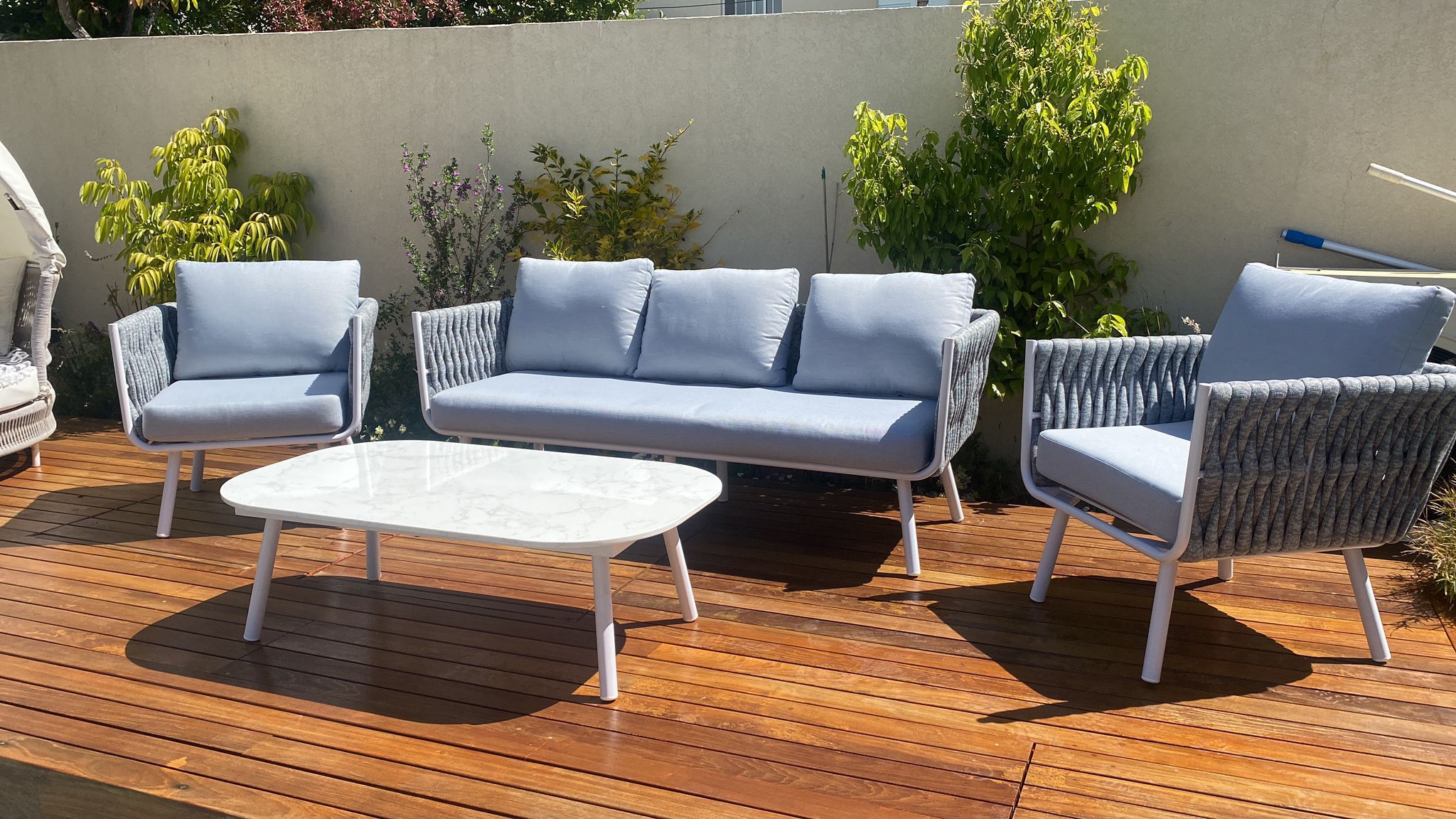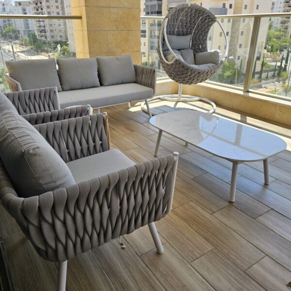 - מערכת ישיבה אלומיניום בחיפוי חבלים עבים עמידים בכל תנאי מזג האוויר ומסוגננים.