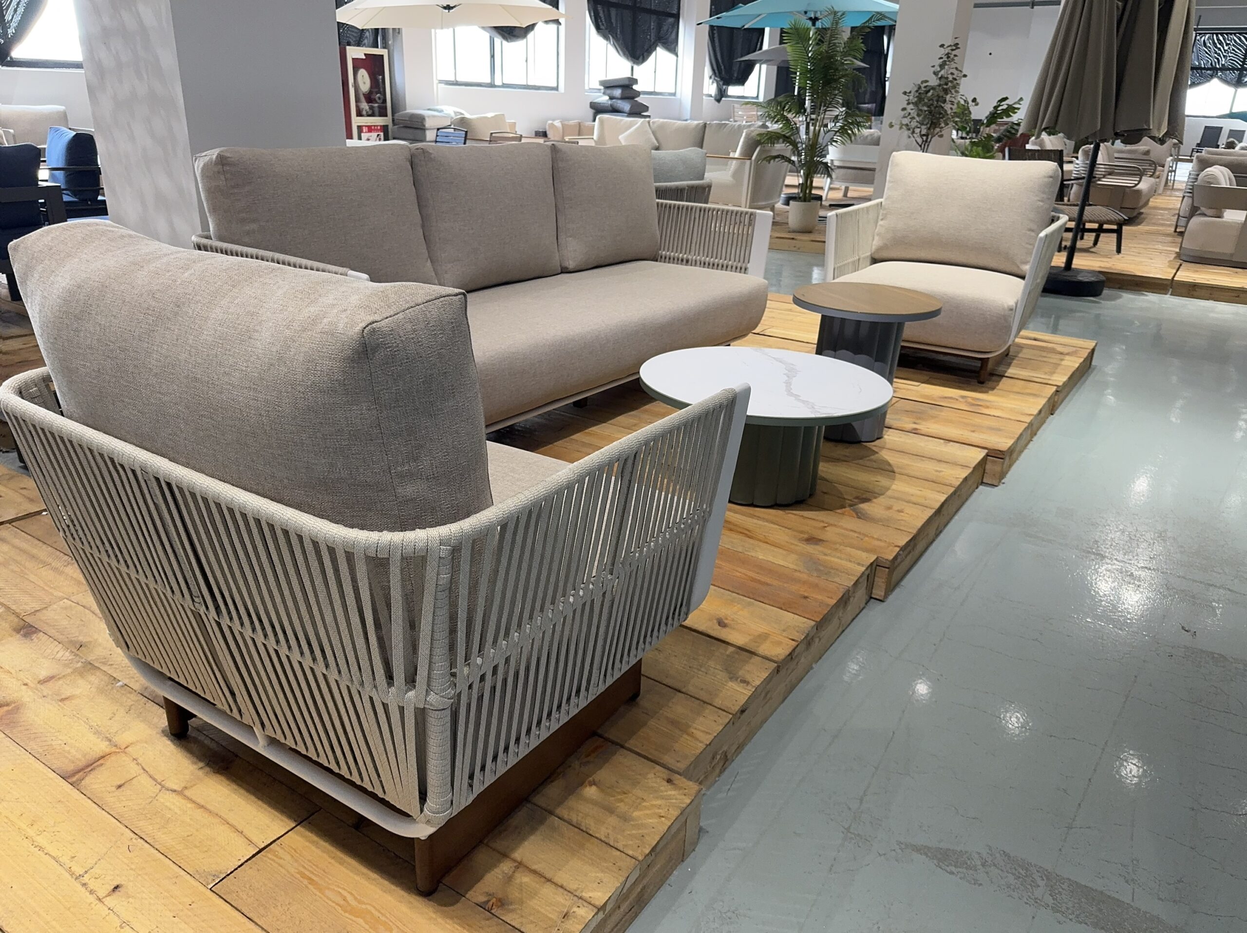פינת ישיבה יוקרתית CASABLANCA: סלון חוץ מפואר, עשוי אלומיניום, חבל אפור בהיר וריפוד אבן. כולל ספה תלת מושבית, 2 כורסאות ושני שולחנות אלומיניום עגולים עם זכוכית קרמית (קוטר 75.5/50 ס"מ). מושלם למרפסת ולגינה!